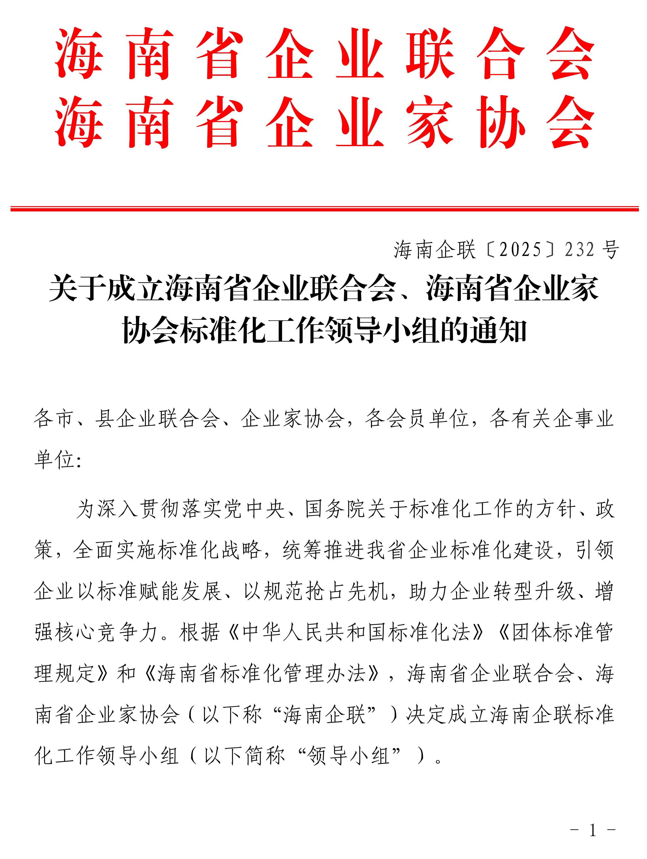 海南企联标准化工作领导小组的通知